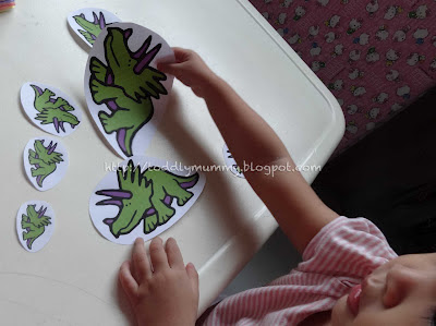EV woke up extremely early today, and the younger boy was still asleep. So we took the opportunity to work on a range of activities that I had prepared, just for situations like these. The activities revolved mainly around 'D for dinosaur, duck and dragon'.